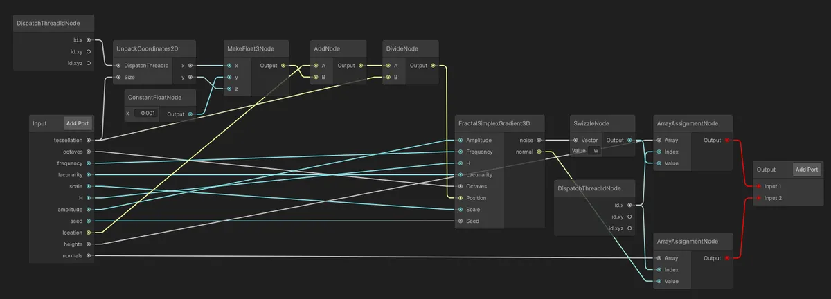 The graph system currently allows you to specify an input node, to which you can add as many parameters as you want to pass from the “outside” code, and then uses the the thread id as coordinates for the generation of the noise. After a few standard mathematical operation nodes, such as Add, Divide, and a few “utility” nodes like Swizzle and ArrayAssignment I can then assign the result of those operations to the output node. Differently from a standard pixel shader, you do not return a set of specific values such as the albedo or emission colours, the normals, etc., but typically you would perform a complex operation and then assign the result to an array of values (or a texture), and then read the values back from the outside code. So, the output nodes tells the graph which nodes should actually be transformed into source code (the red lines). If a node is not connected to the output node, then all nodes that are not connected will not be generated.