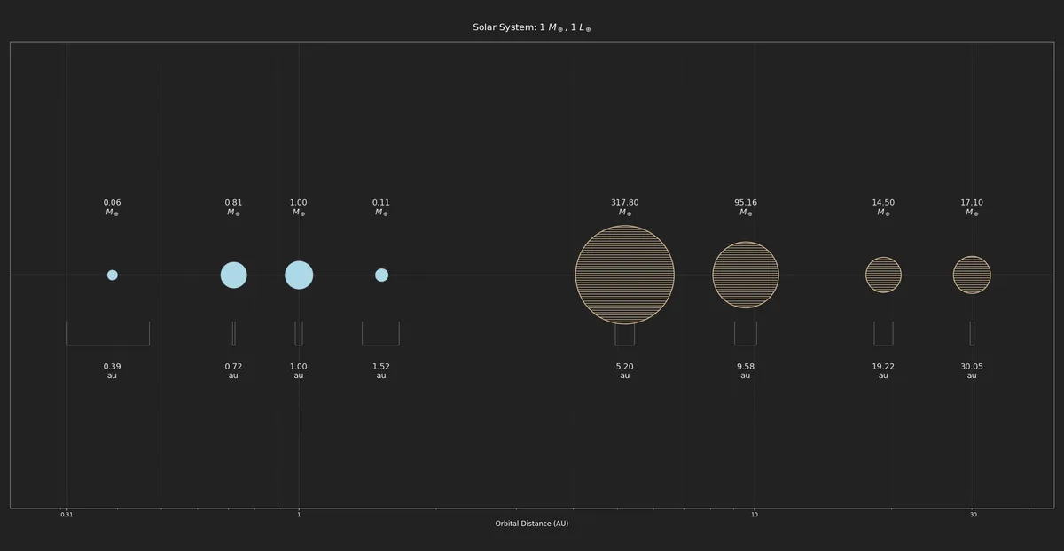 We can see that star systems tend to “correctly” place gas giants further away from the star. Although run 1 and 10 have warm Neptunes (73.75 M🜨 and 43.65 M🜨 at 1.14 and 1.36 au) almost between where Earth and Mars are in our Solar system, a result of planetary migration maybe? There are also some quasi-Jupiters further away. Run 2 has an “interesting” set of three earthlike planets (between 0.7-2.0 M🜨) in a short range of 1.38-1.70 au. Although they look like they overlap in the picture, there are of course millions of km between them. Earthlike candidates? Maybe they could be a bit too cold for our tastes.